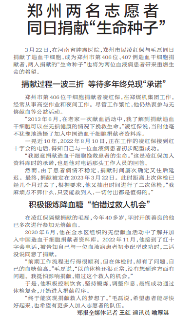 3月22日,在河南省肿瘤医院,郑州市民凌红保与毛磊同日捐献了造血干细胞,成为郑州市第406位、407例造血干细胞捐献者,两人捐献的“生命种子”也将为两位血液病患者带来重燃生命的希望。(今日《郑州日报》5版)