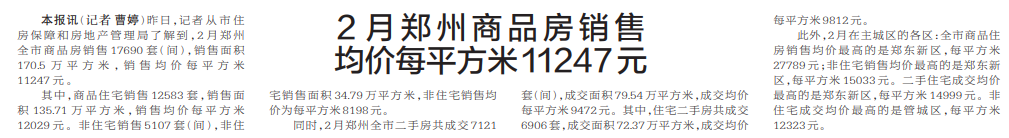 昨日,记者从市住房保障和房地产管理局了解到,2月郑州全市商品房销售17690套(间),销售面积170.5万平方米,销售均价每平方米11247元。(今日《郑州日报》6版)