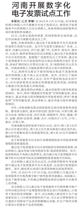 自2023年3月22日起,在河南省的部分纳税人中开展数字化电子发票试点,使用电子发票服务平台的纳税人为试点纳税人,具体范围由国家税务总局河南省税务局确定。(今日《郑州日报》6版)