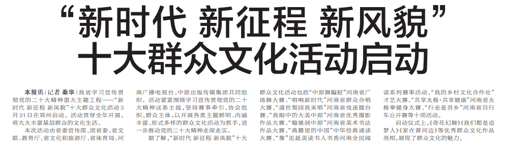 我省学习宣传贯彻党的二十大精神重大主题工程——“新时代 新征程 新风貌”十大群众文化活动3月21日在郑州启动。活动贯穿全年开展,将大大丰富基层群众的文化生活。(今日《郑州日报》8版)