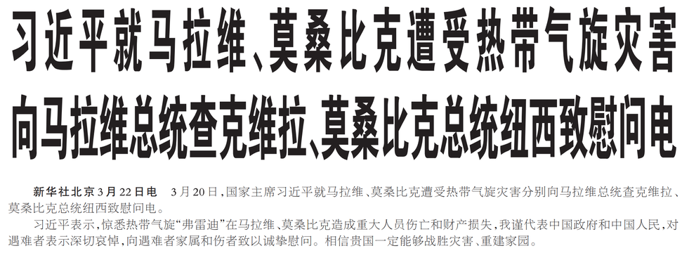 3月20日,国家主席习近平就马拉维、莫桑比克遭受热带气旋灾害分别向马拉维总统查克维拉、莫桑比克总统纽西致慰问电。(今日《人民日报》1版)
