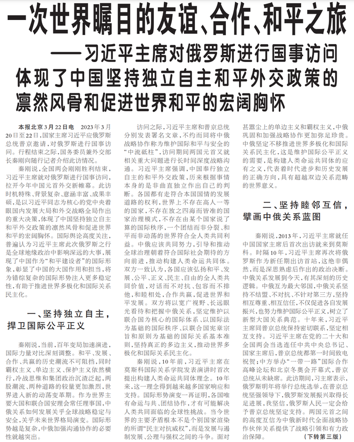 2023年3月20日至22日,国家主席习近平应俄罗斯总统普京邀请,对俄罗斯进行国事访问。行程结束之际,国务委员兼外交部长秦刚向随行记者介绍此访情况。(今日《人民日报》1版、3版)