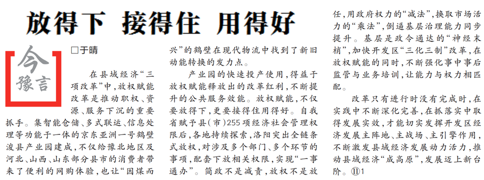 在县域经济“三项改革”中,放权赋能改革是推动职权、资源、服务下沉的重要抓手。集智能仓储、多式联运、信息处理等功能于一体的京东亚洲一号鹤壁浚县产业园建成,不仅给豫北地区及河北、山西、山东部分县市的消费者带来了便利的网购体验,也让“因煤而兴”的鹤壁在现代物流中找到了新旧动能转换的发力点。(今日《人民日报》1版)