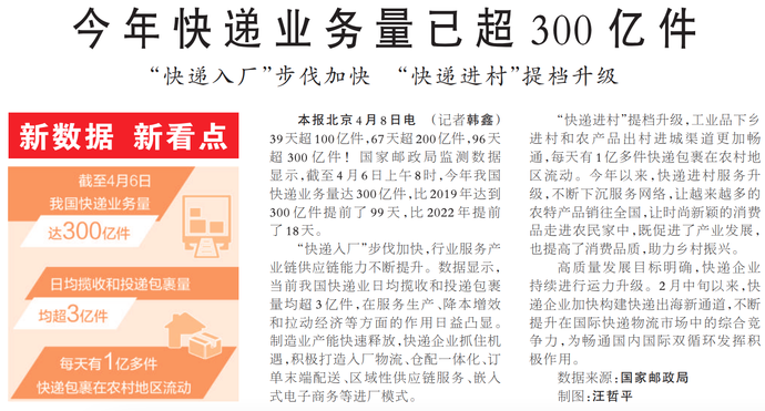 39天超100亿件,67天超200亿件,96天超300亿件!国家邮政局监测数据显示,截至4月6日上午8时,今年我国快递业务量达300亿件,比2019年达到300亿件提前了99天,比2022年提前了18天。(今日《人民日报》1版)