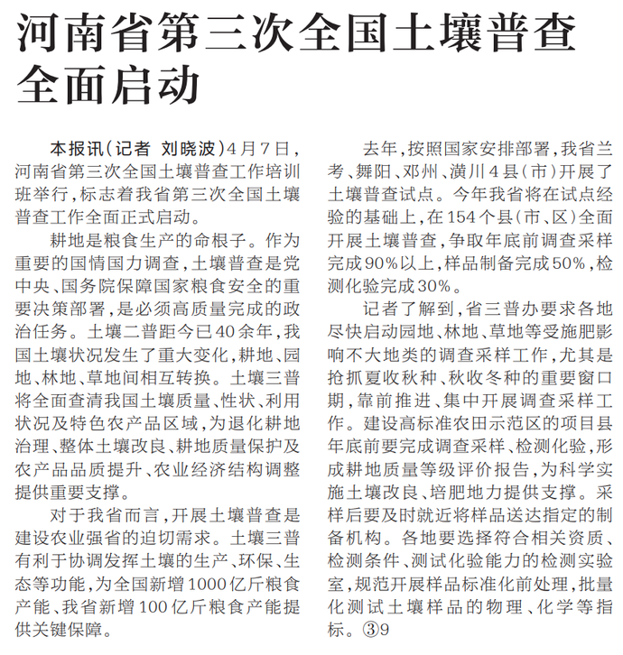 4月7日,河南省第三次全国土壤普查工作培训班举行,标志着我省第三次全国土壤普查工作全面正式启动。(今日《河南日报》1版)