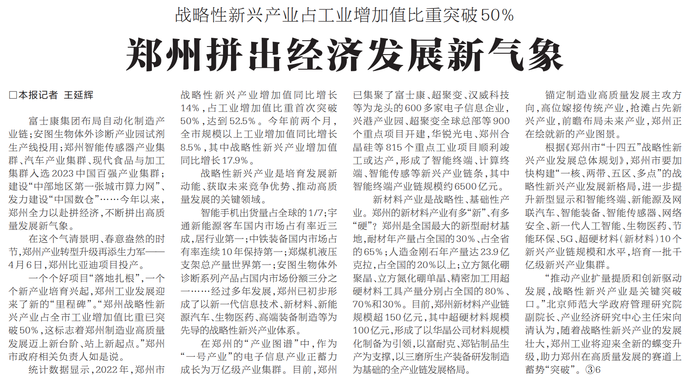富士康集团布局自动化制造产业链;安图生物体外诊断产业园试剂生产线投用;郑州智能传感器产业集群、汽车产业集群、现代食品与加工集群入选2023中国百强产业集群;建设“中部地区第一张城市算力网”、发力建设“中国数仓”……今年以来,郑州全力以赴拼经济,不断拼出高质量发展新气象。(今日《河南日报》2版)