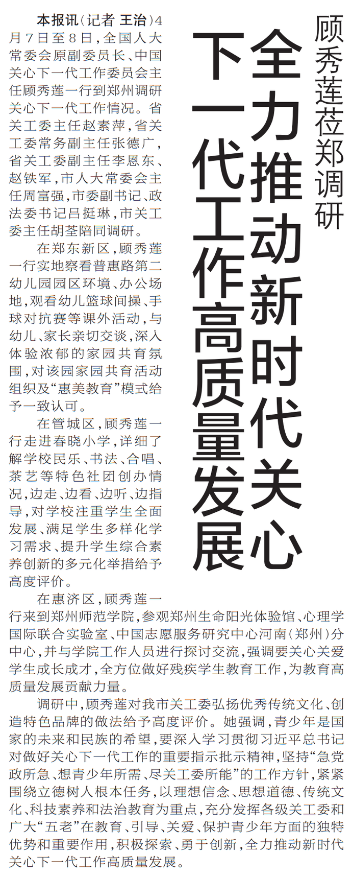 4月7日至8日,全国人大常委会原副委员长、中国关心下一代工作委员会主任顾秀莲一行到郑州调研关心下一代工作情况。省关工委主任赵素萍,省关工委常务副主任张德广,省关工委副主任李恩东、赵铁军,市人大常委会主任周富强,市委副书记、政法委书记吕挺琳,市关工委主任胡荃陪同调研。(今日《郑州日报》1版)