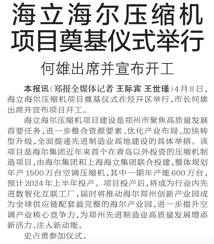 4月8日,海立海尔压缩机项目奠基仪式在经开区举行,市长何雄出席并宣布项目开工。(今日《郑州日报》1版)