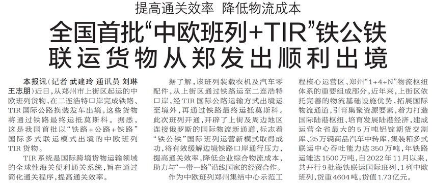 全国首批“中欧班列+TIR”铁公铁联运货物从郑发出顺利出境