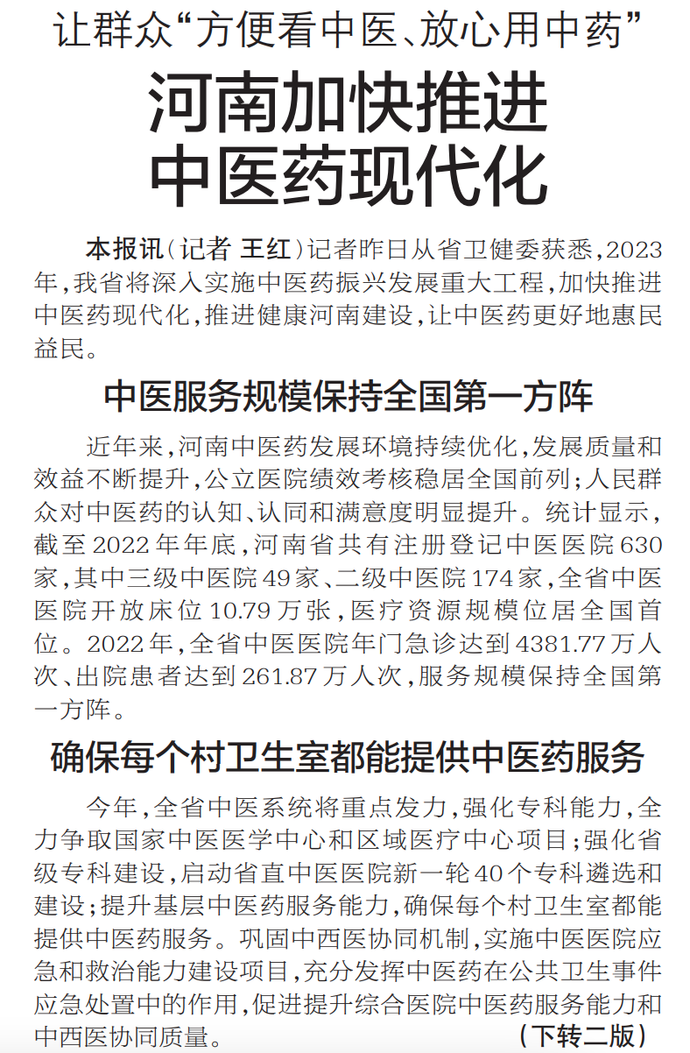 记者昨日从省卫健委获悉,2023年,我省将深入实施中医药振兴发展重大工程,加快推进中医药现代化,推进健康河南建设,让中医药更好地惠民益民。(今日《郑州日报》1版、2版)