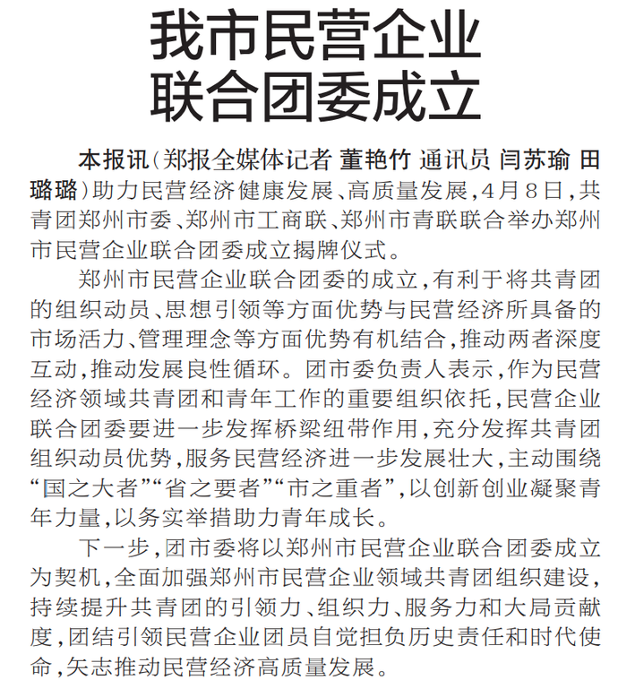 助力民营经济健康发展、高质量发展,4月8日,共青团郑州市委、郑州市工商联、郑州市青联联合举办郑州市民营企业联合团委成立揭牌仪式。(今日《郑州日报》1版)