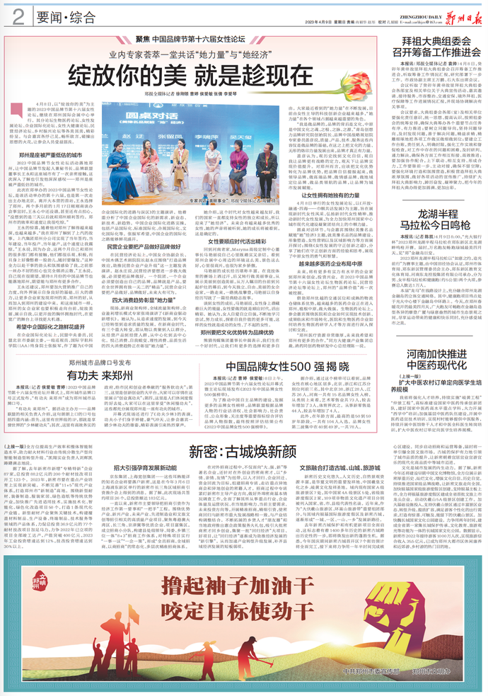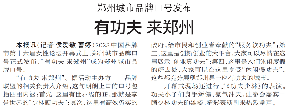 2023中国品牌节第十六届女性论坛开幕式上,郑州城市品牌口号正式发布,“有功夫 来郑州”成为郑州城市品牌口号。(今日《郑州日报》2版)