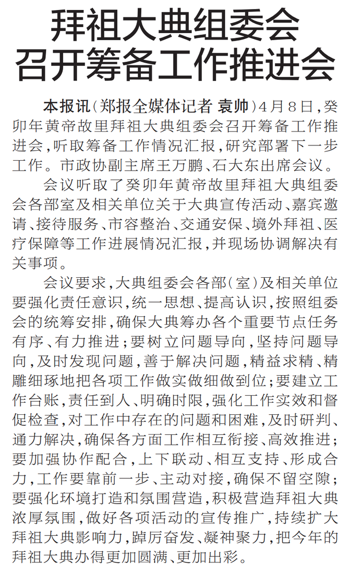 4月8日,癸卯年黄帝故里拜祖大典组委会召开筹备工作推进会,听取筹备工作情况汇报,研究部署下一步工作。市政协副主席王万鹏、石大东出席会议。(今日《郑州日报》2版)