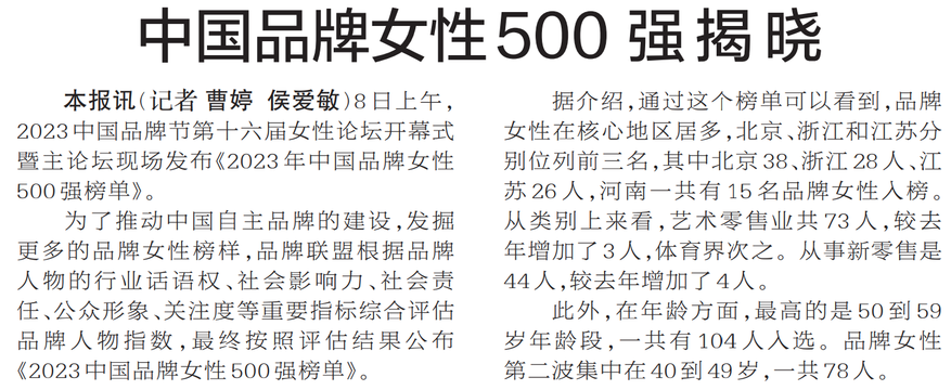 8日上午,2023中国品牌节第十六届女性论坛开幕式暨主论坛现场发布《2023年中国品牌女性500强榜单》。(今日《郑州日报》2版)