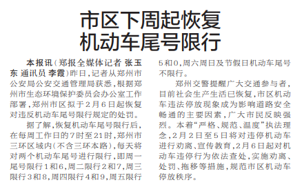 昨日,记者从郑州市公安局公安交通管理局获悉,根据郑州市生态环境保护委员会办公室工作部署,郑州市区拟于2月6日起恢复对违反机动车尾号限行规定的处罚。(今日《郑州日报》1版)