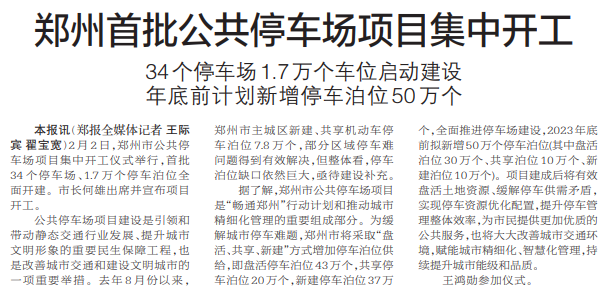 2月2日,郑州市公共停车场项目集中开工仪式举行,首批34个停车场、1.7万个停车泊位全面开建。市长何雄出席并宣布项目开工。(今日《郑州日报》1版)