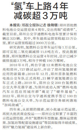 郑州首批燃料电池公交运营迎来4周年,交出亮眼“成绩单”, 截至目前,郑州公交宇通燃料电池车型累计保有辆达323辆。其中,单车最高运营里程超23万公里,累计运营里程超过3000万公里。(今日《郑州日报》1版)