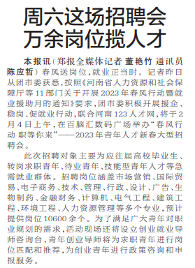 春风送岗位,就业正当时。记者昨日从团市委获悉,按照《河南省人力资源和社会保障厅等11部门关于开展2023年春风行动暨就业援助月的通知》要求,团市委积极开展援企、稳岗、促就业行动,联合河南123人才网,将于2月4日上午,在百脑汇数码广场举办“春风行动 职等你来”——2023年青年人才新春大型招聘会。(今日《郑州日报》1版)