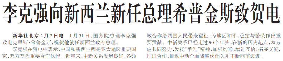 1月31日,国务院总理李克强致电克里斯·希普金斯,祝贺他就任新西兰政府总理。(今日《人民日报》1版)