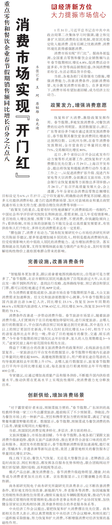 消费市场实现“开门红”。据商务部监测,全国重点零售和餐饮企业销售额与去年春节假期相比增长6.8%,促消费活动丰富多彩,年货等商品销售旺盛,休闲消费精彩纷呈,生活必需品货丰价稳。