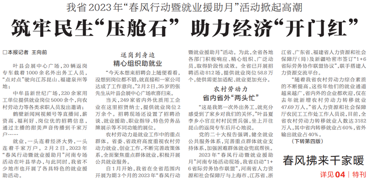 就业,一头连着经济大势,一头连着千家万户。2月2日,2023年“春风行动暨就业援助月”河南专场活动在叶县举办,与此同时,我省不少地市也开展了各具特色的就业援助活动。(今日《河南日报》1版、4版)
