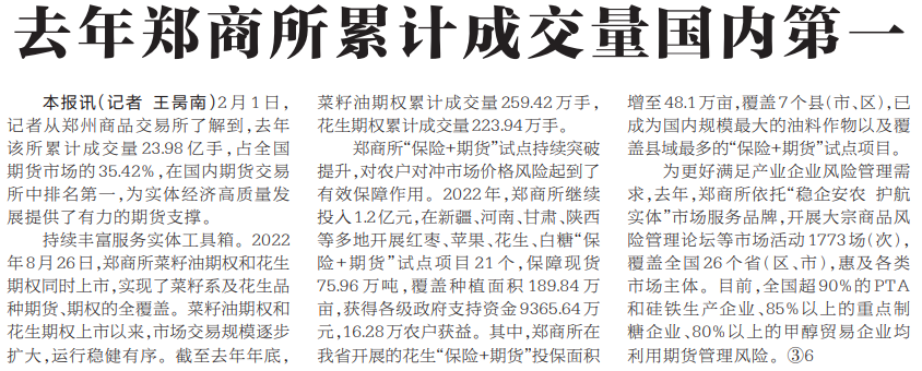 2月1日,记者从郑州商品交易所了解到,去年该所累计成交量23.98亿手,占全国期货市场的35.42%,在国内期货交易所中排名第一,为实体经济高质量发展提供了有力的期货支撑。(今日《河南日报》1版)