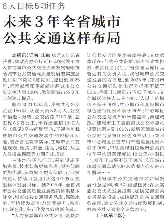2月2日记者获悉,省政府办公厅近日印发《关于深入贯彻城市公共交通优先发展战略推动城市公共交通高质量发展的实施意见》(以下简称《意见》),提出到2025年,河南新增和更新新能源城市公交车比例达到100%,氢能源城市公交车比例逐步提升。(今日《河南日报》1版、2版)