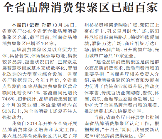 3月14日,省商务厅公布全省第六批品牌消费集聚区名单,截至目前,河南省品牌消费集聚区已增至104家。(今日《河南日报》1版)