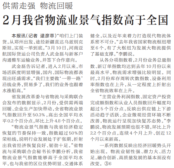 “咱们上门装货,从郑州出发,途经新疆直达乌兹别克斯坦,实现一单到底。”3月10日,河南亚航国际货运公司负责人武金磊与新客户沟通整车运输业务,并签下合作意向。(今日《河南日报》2版)