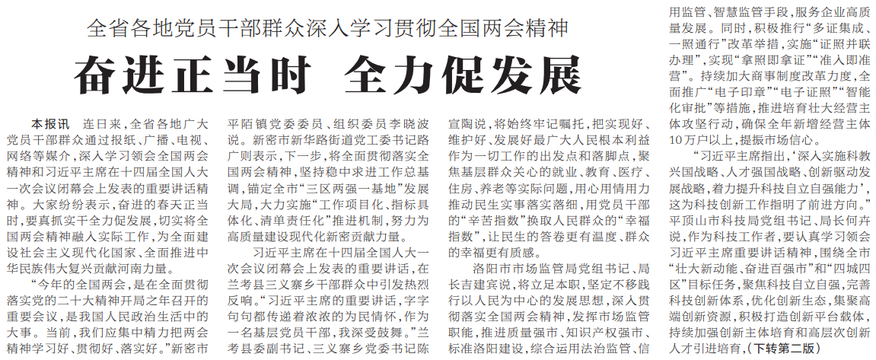 连日来,全省各地广大党员干部群众通过报纸、广播、电视、网络等媒介,深入学习领会全国两会精神和习近平主席在十四届全国人大一次会议闭幕会上发表的重要讲话精神。大家纷纷表示,奋进的春天正当时,要真抓实干全力促发展,切实将全国两会精神融入实际工作,为全面建设社会主义现代化国家、全面推进中华民族伟大复兴贡献河南力量。(今日《河南日报》1版、2版)