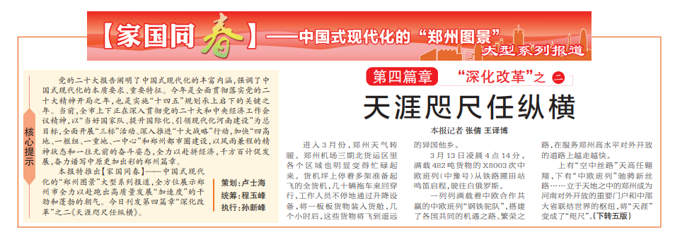 本报特推出【家国同春】——中国式现代化的“郑州图景”大型系列报道,全方位展示郑州市全力以赴跑出高质量发展“加速度”的干劲和蓬勃的朝气。今日刊发第四篇章“深化改革”之二《天涯咫尺任纵横》。