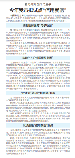 编制郑州医保服务“电子地图”;“双通道”药店扩展至30家;试点推进“信用就医”服务……3月14日,记者从全市医疗保障经办工作会议上获悉,2023年,省会医保经办机构将着力办好系列“民生事”。(今日《郑州日报)5版)