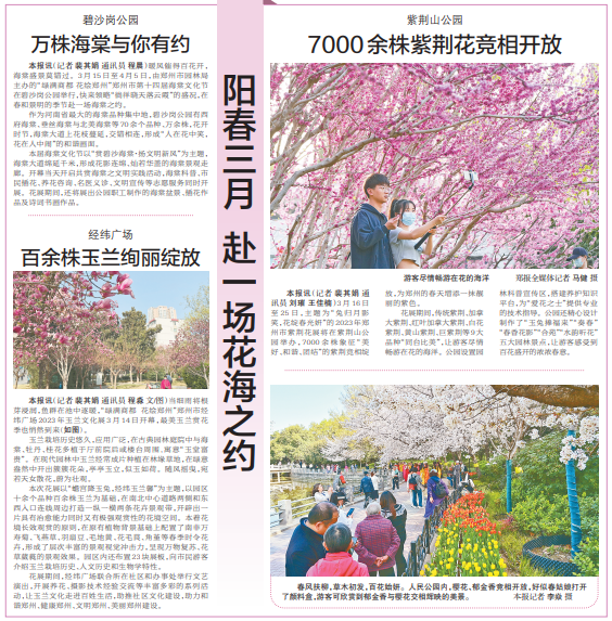 3月16日至25日,主题为“兔归月影笑,花绽春光妍”的2023年郑州市紫荆花展将在紫荆山公园举办,7000余株象征“美好、和谐、团结”的紫荆竞相绽放,为郑州的春天增添一抹靓丽的紫色。(今日《郑州日报)5版)