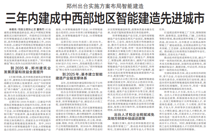 打造建筑业智能建造新业态,树立中部地区智能建筑试点城市新标杆。市政府近日印发《郑州市智能建造试点城市实施方案》,其中提到,我市将推进建筑业智能建造工作,2025年底前,以建设中西部地区智能建造先进城市为目标,基本建成政策体系完善、市场内生机制有效、示范标杆效应明显、市场主体充满活力、质量安全水平明显提升的建筑业智能建造发展体系;2035年底前,郑州市建筑业发展质量和效益全面提升,“郑州智能建造”核心竞争力达到国内领先水平。(今日《郑州日报)6版)
