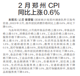 国家统计局郑州调查队昨日发布信息,2023年2月,我市居民消费价格同比上涨0.6%,环比下降0.4%。