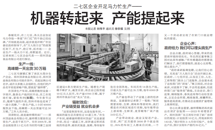春暖花开,在二七区,各大企业加足马力夺取一季度“开门红”的干劲已经拉满。“开局就是决战,起步就是冲刺!”在区委区政府指导下,在“万人助万企”的政策红利下,忙生产、抢订单、拓市场…… 企业生产一线火力十足,高歌猛进。近日,记者来到二七区企业代表——郑州顶益食品有限公司进行探访。(今日《郑州日报)7版)