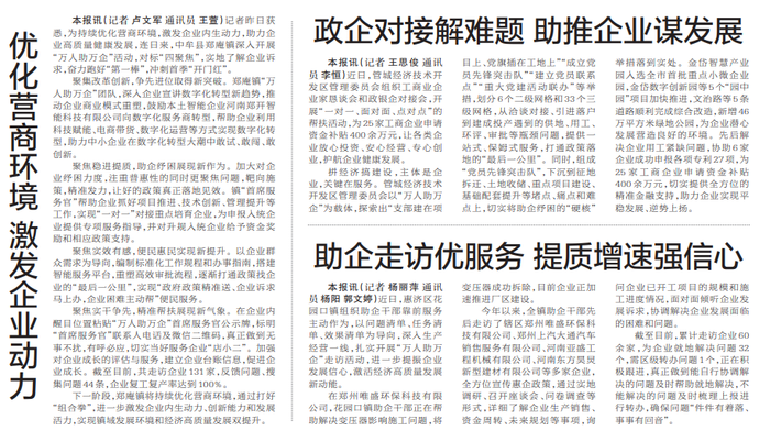 记者昨日获悉,为持续优化营商环境,激发企业内生动力,助力企业高质量健康发展,连日来,中牟县郑庵镇深入开展“万人助万企”活动,对标“四聚焦”,实地了解企业诉求,奋力跑好“第一棒”,冲刺首季“开门红”。(今日《郑州日报)7版)