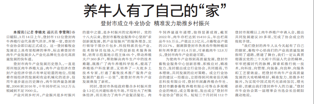 春日暖阳,3月14日上午,登封市112位登封肉牛养殖行业代表喜气洋洋,齐聚一堂,登封市牛业协会即日起正式成立。这一登封畜牧业发展史上具有里程碑的事件,标志着登封市肉牛产业发展步入产业化品牌化生态化高质量发展的快车道。(今日《郑州日报)7版)