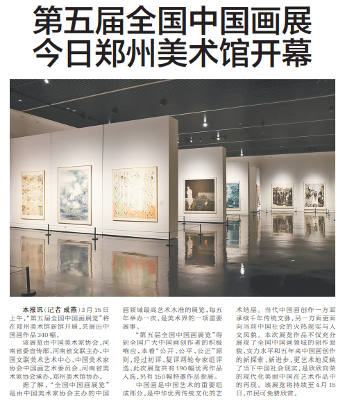 3月15日上午,“第五届全国中国画展览”将在郑州美术馆新馆开展,共展出中国画作品340幅。(今日《郑州日报)8版)