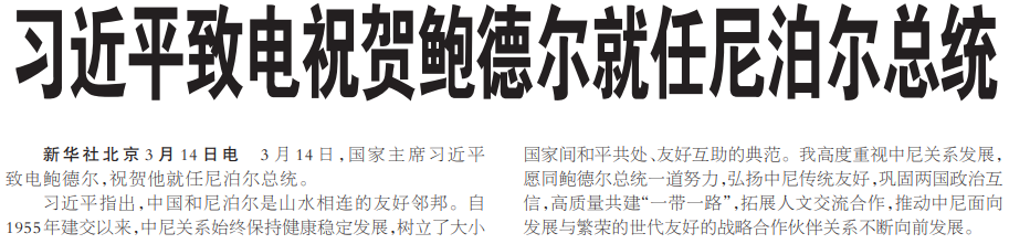 3月14日,国家主席习近平致电鲍德尔,祝贺他就任尼泊尔总统。(今日《人民日报》1版)