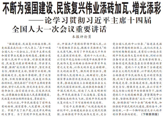 “强国建设、民族复兴的接力棒,历史地落在我们这一代人身上。”在十四届全国人大一次会议上,习近平主席从党和国家事业发展全局的高度,着眼全党全国人民的中心任务,对推进强国建设、民族复兴提出明确要求、作出重大部署,强调“我们要只争朝夕,坚定历史自信,增强历史主动,坚持守正创新,保持战略定力,发扬斗争精神,勇于攻坚克难,不断为强国建设、民族复兴伟业添砖加瓦、增光添彩!”习近平主席的重要讲话,坚守人民立场、坚定历史自信、彰显使命担当、指引前进方向,引发热烈反响,必将激励全国各族人民在强国建设、民族复兴新征程踔厉奋发、勇毅前行。(今日《人民日报》1版、4版)