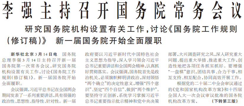 国务院总理李强3月14日主持召开新一届国务院第一次常务会议,研究国务院机构设置有关工作,讨论《国务院工作规则(修订稿)》。新一届国务院开始全面履职。(今日《人民日报》1版、3版)