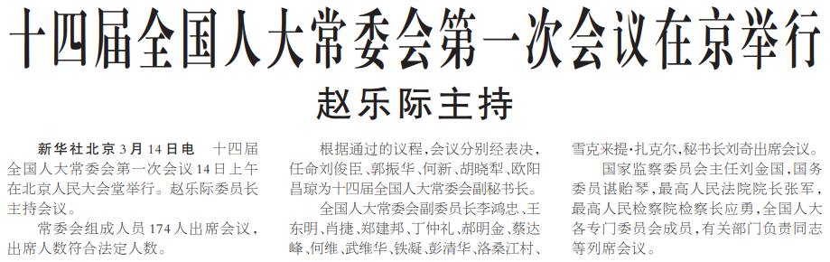 十四届全国人大常委会第一次会议14日上午在北京人民大会堂举行。赵乐际委员长主持会议。(今日《人民日报》1版)