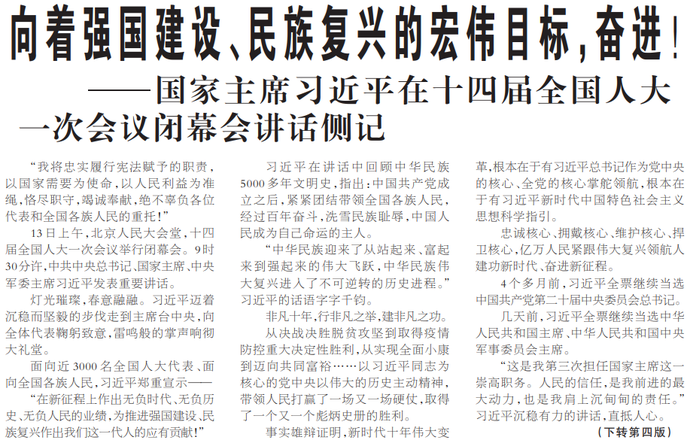 ——国家主席习近平在十四届全国人大一次会议闭幕会讲话侧记
