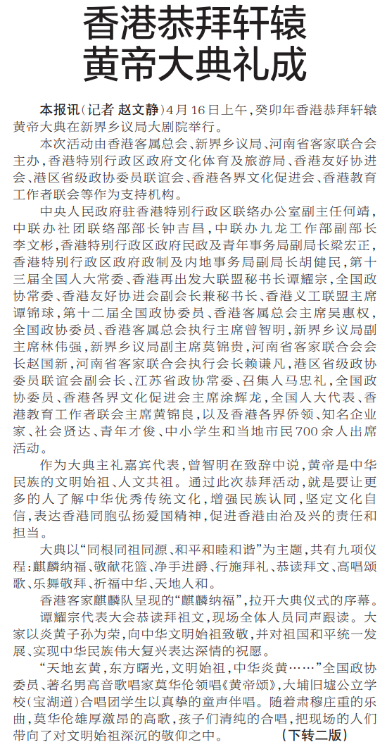 4月16日上午,癸卯年香港恭拜轩辕黄帝大典在新界乡议局大剧院举行。(今日《郑州日报》1版、2版)
