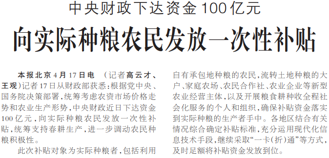 记者17日从财政部获悉:根据党中央、国务院决策部署,统筹考虑农资市场价格走势和农业生产形势,中央财政近日下达资金100亿元,向实际种粮农民发放一次性补贴,统筹支持春耕生产,进一步调动农民种粮积极性。(今日《人民日报》2版)