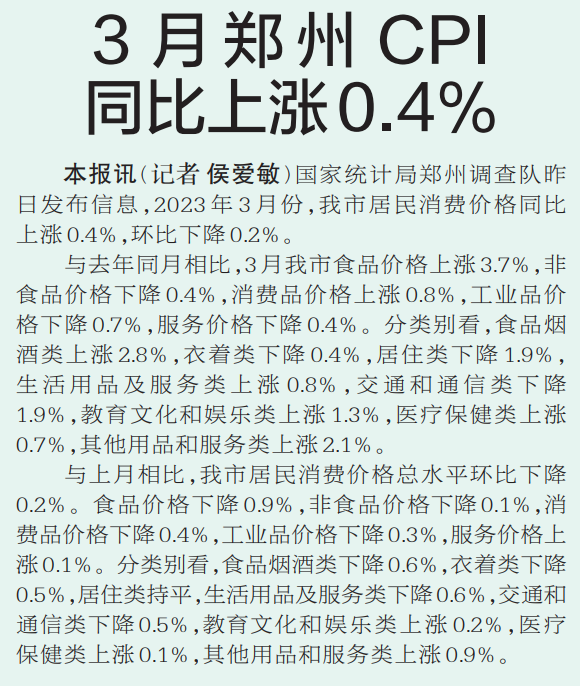 国家统计局郑州调查队昨日发布信息,2023年3月份,我市居民消费价格同比上涨0.4%,环比下降0.2%。(今日《郑州日报》5版)