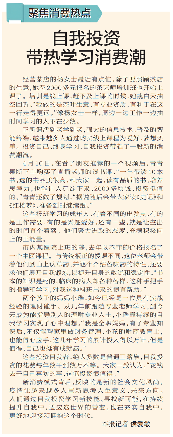 经营茶店的杨女士最近有点忙,除了要照顾茶店的生意,她花2000多元报名的茶艺师培训班也开始上课了。培训是线上课,赶不及上课的时候,她就白天抽空回听。“我做的是茶叶生意,有专业资质,有利于在这一行走得更远。”像杨女士一样,周边一边工作一边抽时间学习的人不在少数。(今日《郑州日报》5版)