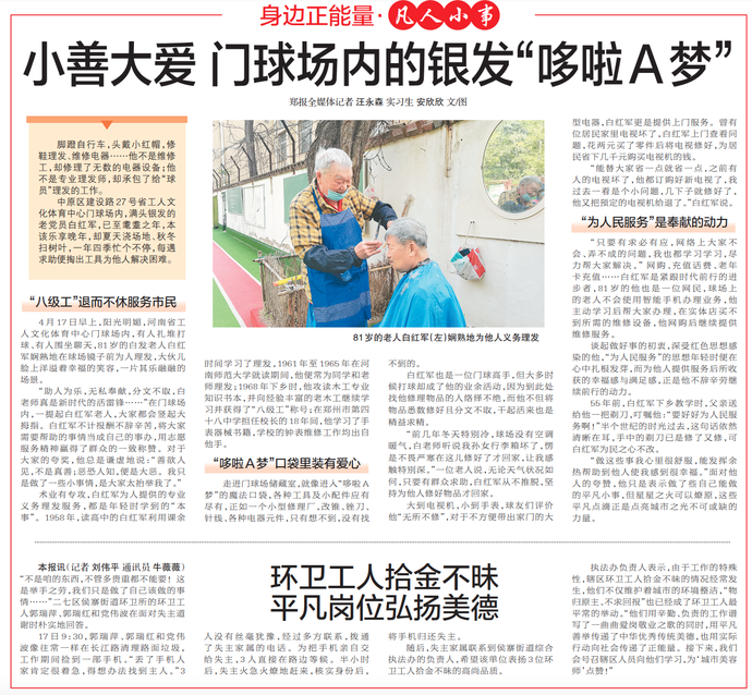 脚蹬自行车,头戴小红帽,修鞋理发、维修电器……他不是维修工,却修理了无数的电器设备;他不是专业理发师,却承包了给“球员”理发的工作。(今日《郑州日报》6版)
