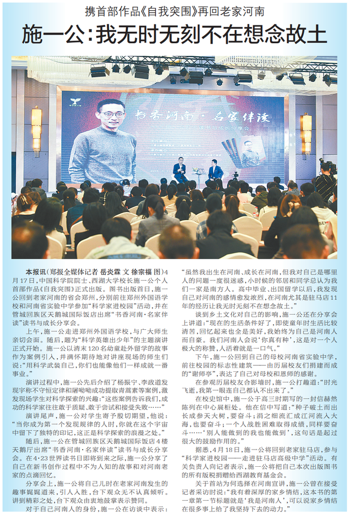 4月17日,中国科学院院士、西湖大学校长施一公个人首部作品《自我突围》正式出版。图书出版首日,施一公回到老家河南的省会郑州,分别前往郑州外国语学校和河南省实验中学参加“科学家进校园”活动,并在管城回族区天鹅城国际饭店出席“书香河南·名家伴读”读书与成长分享会。(今日《郑州日报》6版)